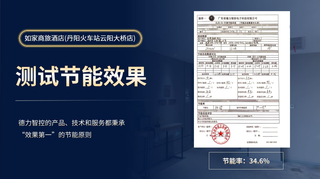 近日,德力智控為丹陽市如家商旅酒店空調(diào)設(shè)備節(jié)能改造,實地打樣節(jié)能率34.6%!